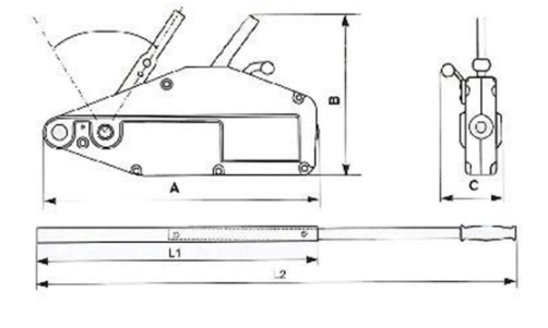 型號 | 額定載荷 | 額定載荷時手拉力 | 額定載荷時手柄往復一次鋼絲繩行程 | 鋼絲繩直徑 | 葫蘆重量 | 外形尺寸 |