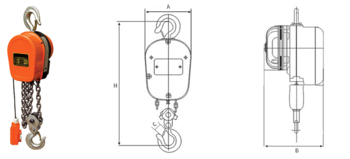 型號 | 額定載荷 | 實驗載荷 | 電機功率 | 電源 | 提升速度 | 起重鏈條數 | 標準起升高度 | 圓鋼直徑 | 主要尺寸 | 凈重 | 裝箱尺寸 | 起重高度每1M加重量 | ||||